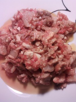 Un cop heu fet el brou, traieu la carn de l'olla i la deixeu refreda. Mentrestant, ratlleu 3 o 4 tomàquets i els fregiu. Afegiu una mica de sal i sucre, per traure l'acidesa dels tomàquets. Talleu la carn a trossos petits, i quan teniu el tomàquet fregit, afegiu la carn i la barregeu bé amb el tomàquet. I ja teniu el plat llest. Una recepta molt fàcil de fer!